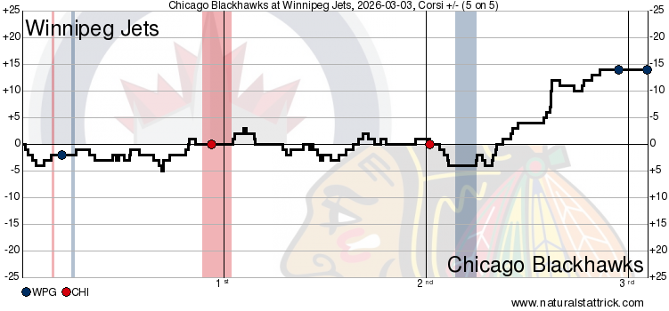 In terms of puck possession, the Hawks kept things fairly close with a 50 percent shot attempt share at 5v5 (Corsi) in the first and a 48.15 percent Corsi in the second. The Jets dialed up the pressure with a 70.97 percent Corsi in the third, and even though they only had one high danger chance through the first two periods, Winnipeg had six at 5v5 in the third frame.