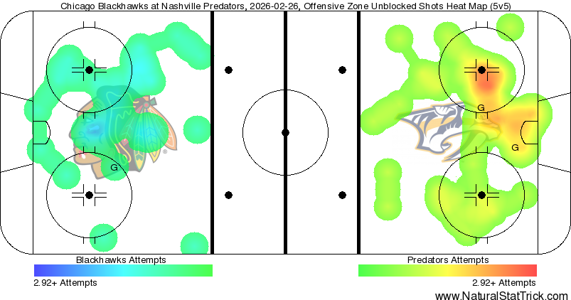 Sunday's game against Utah saw their 5v5 production from the fourth line with a goal from Nick Foligno and Landon Slaggert. Teuvo Teravainen scored a goal on the power play and the penalty kill. At 5v5, Bedard had four shot attempts and three shots on goal (as did linemate Ryan Greene). Nazar had one shot attempt. The Blackhawks as a whole finished with a 45.12 percent shot attempt share and a 40.19 expected goals share at 5v5.